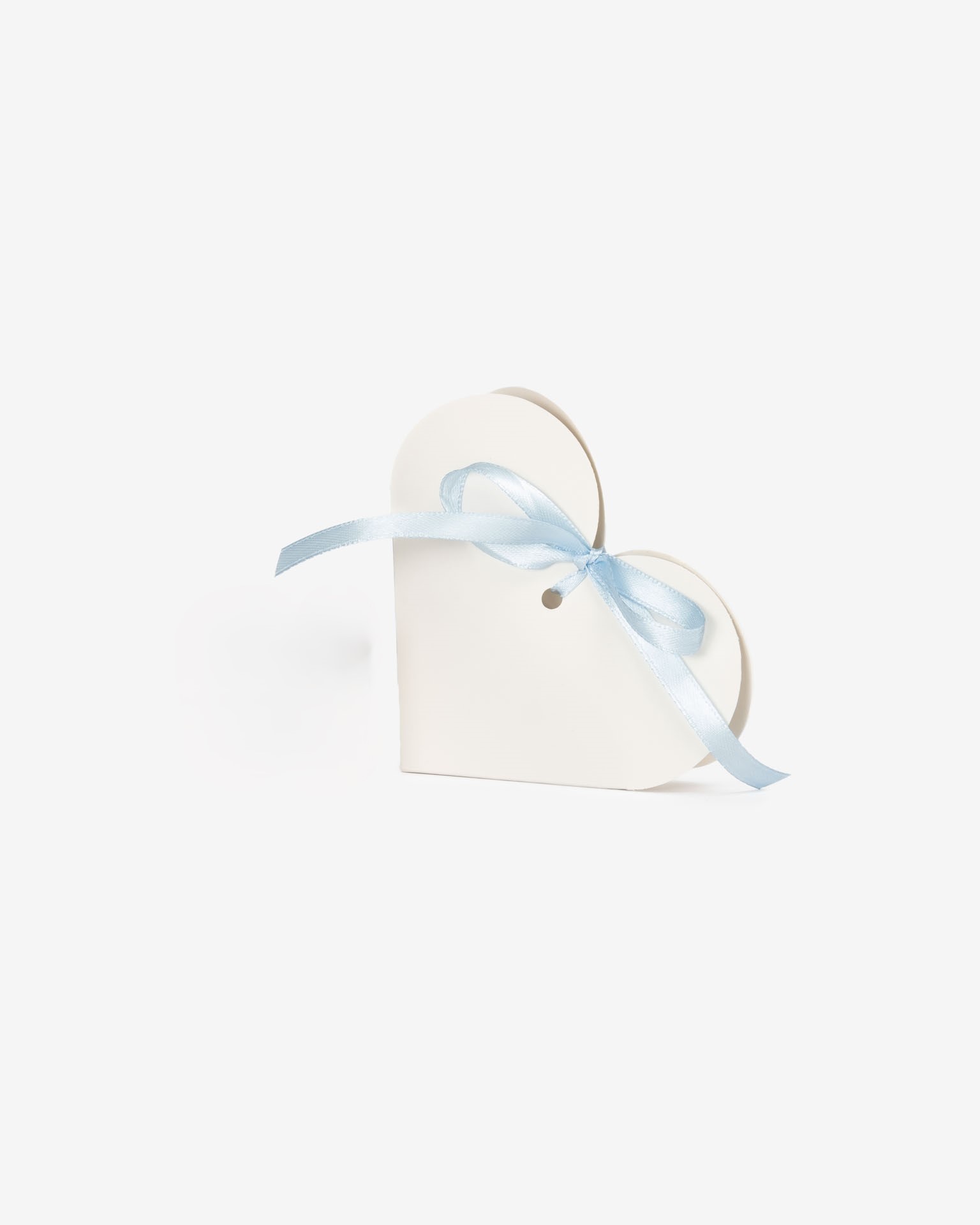 Bomboniera portaconfetti a forma di cuore, in carta Fedrigoni Free Vellum White. Completano la bomboniera: una pergamena con la scritta “Con il Cuore” che spiega il gesto solidale, un nastro di un colore a scelta  tra rosa, celeste, rosso, bianco, giallo, verde, argento, oro ed infine dei buonissimi confetti del commercio equo-solidale.
